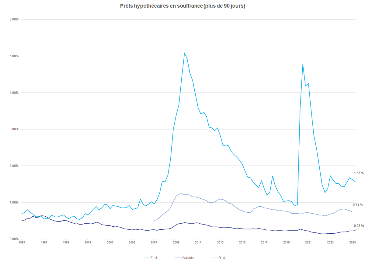 Selon les chiffres de juillet 2025, soit les plus récentes statistiques sur les prêts hypothécaires, le taux national des prêts hypothécaires en souffrance se place à 0,23 % ou à moins d’un quart de point de pourcentage. Ce taux est de loin inférieur aux taux constatés aux États‑Unis et au Royaume‑Uni. Malgré une légère hausse récente, le taux des prêts en souffrance au Canada est toujours proche des faibles records historiques.