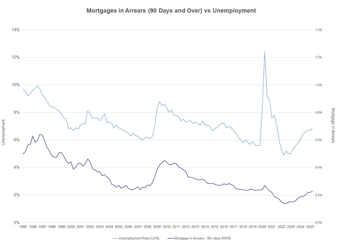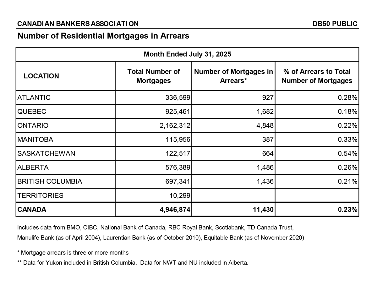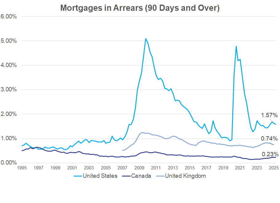 As of July 2025, the most recent statistics available, the national arrears rate was 0.23%, which means that less than a quarter of a percentage point of mortgages are in arrears. This is well below levels in the United States and the United Kingdom. While arrears rates in Canada have edged upward in recent months, they are still close to historic lows.